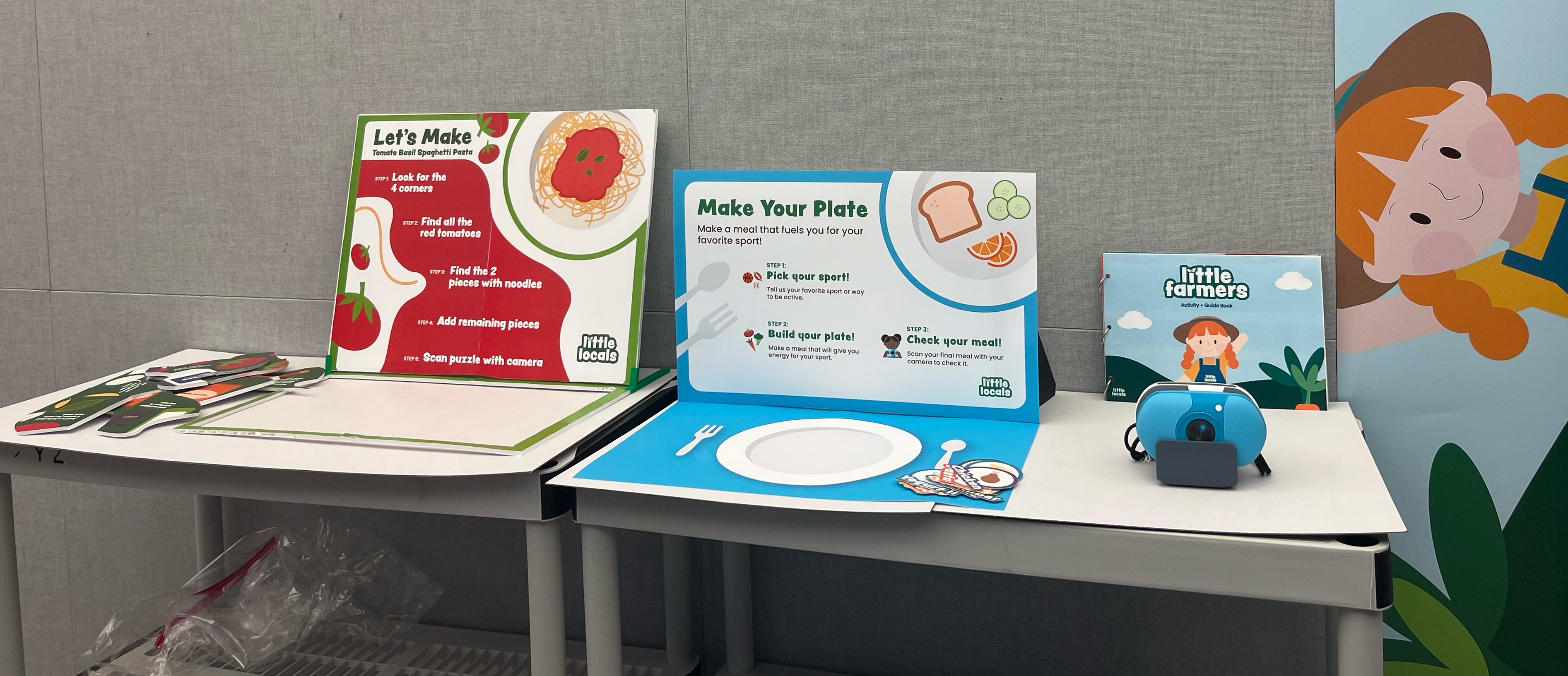 A service for 5-8 year olds that is sold to farmers markets that sets up booths with activities for kids. The kids play and use an interactive camera to learn about where their food comes from, how food affects their bodies and emotions, and how ingredients make a meal.